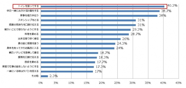 愛妻家が普段の行動の中で、妻に対して気を付けていることは「トイレに座ってする」が一番多い結果になりました。次いで「休日一緒に出かける計画をする」「家事を極力手伝う」といった結果になりました。
