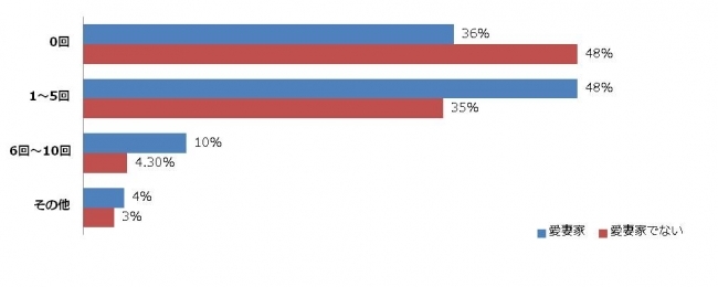 夜の営みに対する問いでは、愛妻家は「1~5回」が48%で一番回答数が多く、愛妻家でない人は「0回」が一番多く57%と、妻への愛情の高さに応じて、夜の営みの回数も変化することが分かりました。