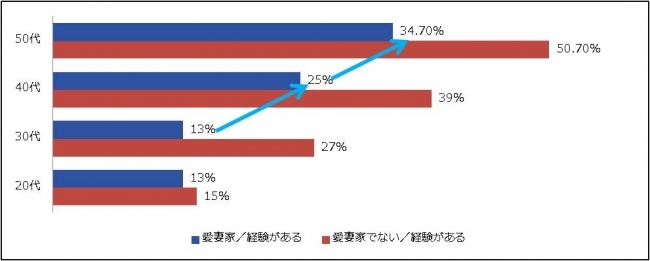 結婚してから妻以外の女性との身体関係についての質問では、愛妻家の20代と30代男性では「経験がある」と回答した人が13%に対して、40代男性が25%(12%増加)、50代男性が35%と、40代を境に増加傾向がある結果になりました。一方、愛妻家でない人は、20代が15%、30代が27%(12%増加)、40代が39%、50代が50.70%と30代を境に増加傾向にあることがわかりました。