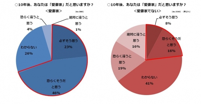 10年後も愛妻家であるかどうかという質問に対しては、愛妻家の7割が「そうだと思う」と回答し、一方で、愛妻家でない人は「そうだと思う」が3割、「わからない」が4割、「違うと思う」が3割以上という結果になりました。