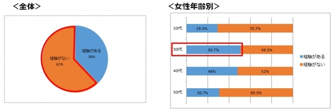 パーティーでガッカリした経験はありますか。という質問に62%が『ない』と 回答し、予想以上にパーティーでガッカリした経験がないことがわかった。また30代女性は、半数以上がガッカリ経験があることがわかった。