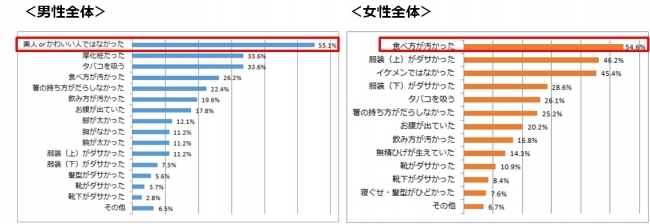 パーティーシーンで、異性のどこを見てガッカリしたかと言う質問では、男性は半数以上の55.1%が顔、33.6%で厚化粧が2位という結果となった。一方女性は、半数以上が『食べ方が汚かった』や『服装がダサかった』が上位となり、男性と比べ、女性は顔ではなく、食べ方や服装を気にする傾向があることがわかった。