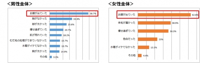 海でガッカリする点、男女ともに『お腹』が1位に。女性は『体毛』『痩せすぎ』が上位に。
