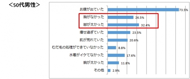 男女ともに海でガッカリするのは、『お腹』が1位という結果になった。女性は、『体毛が濃かった』『痩せすぎていた』という回答が上位となった。また、男女共に水着自体はあまり気にしておらず、水着ということでの露出している部分に目線がいく傾向があることがわかった。 50代男性の結果をみると、『胸』よりも『足』を見ている人が多いという結果になった。